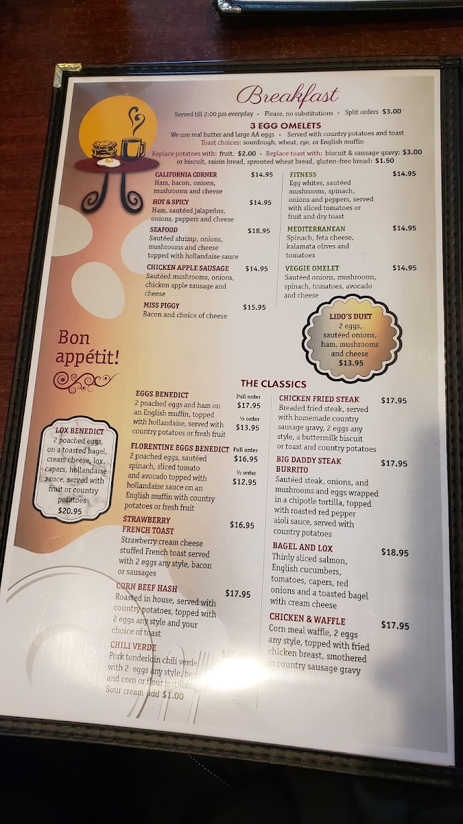 Welcome to Lido Café and Bakery, a cozy gem nestled in Carmichael, CA. This inviting café is known for its hearty breakfast and brunch offerings that bring a delightful twist to classic dishes. The menu features standouts like the Lox Benedict, traditional Eggs Benedict, and flavorful Strawberry French Toast. For a heartier fare, try the Big Daddy Steak Burrito or indulge in Chili Verde.